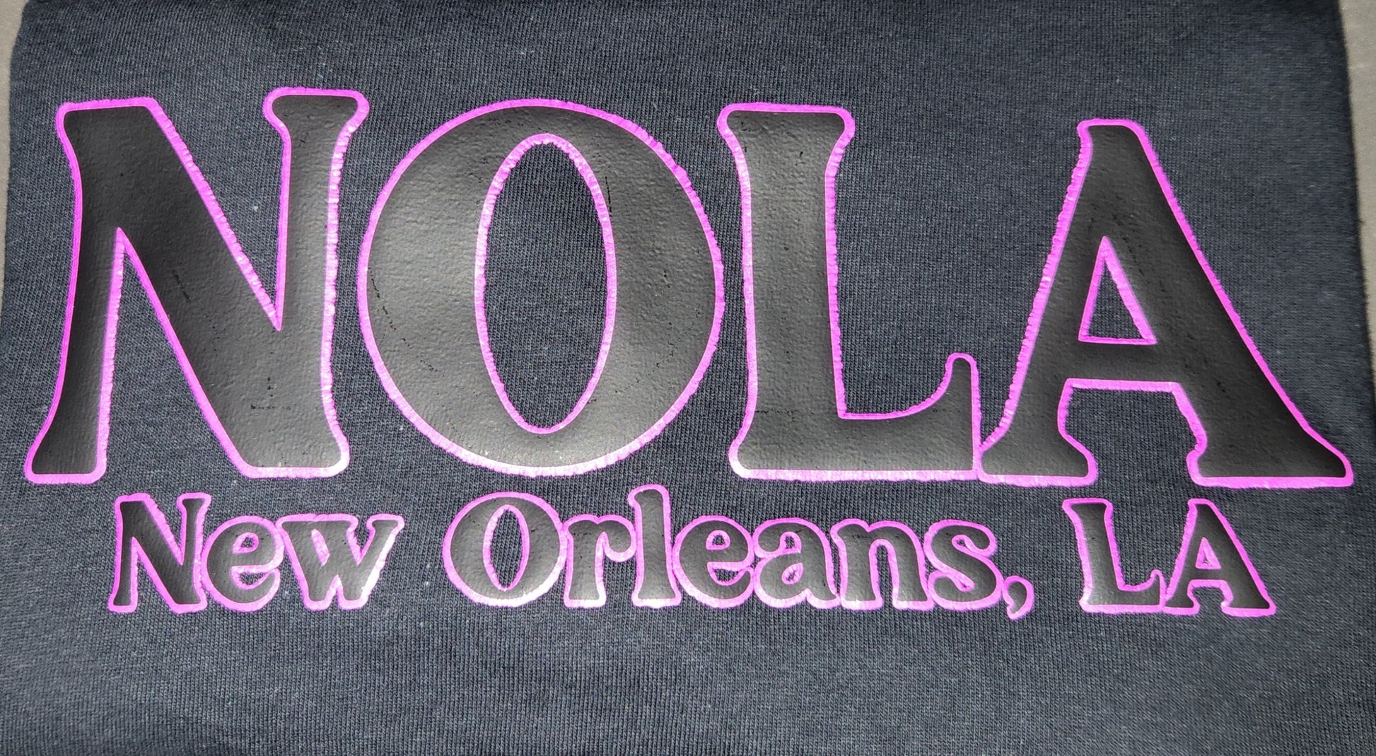 Embrace the Big Easy with this NOLA Puff Graphic Tee. Featuring a unique purple metallic puff vinyl graphic design, this tee is a playful and stylish addition to any wardrobe. Show off your love for New Orleans with this quirky and eye-catching tee.